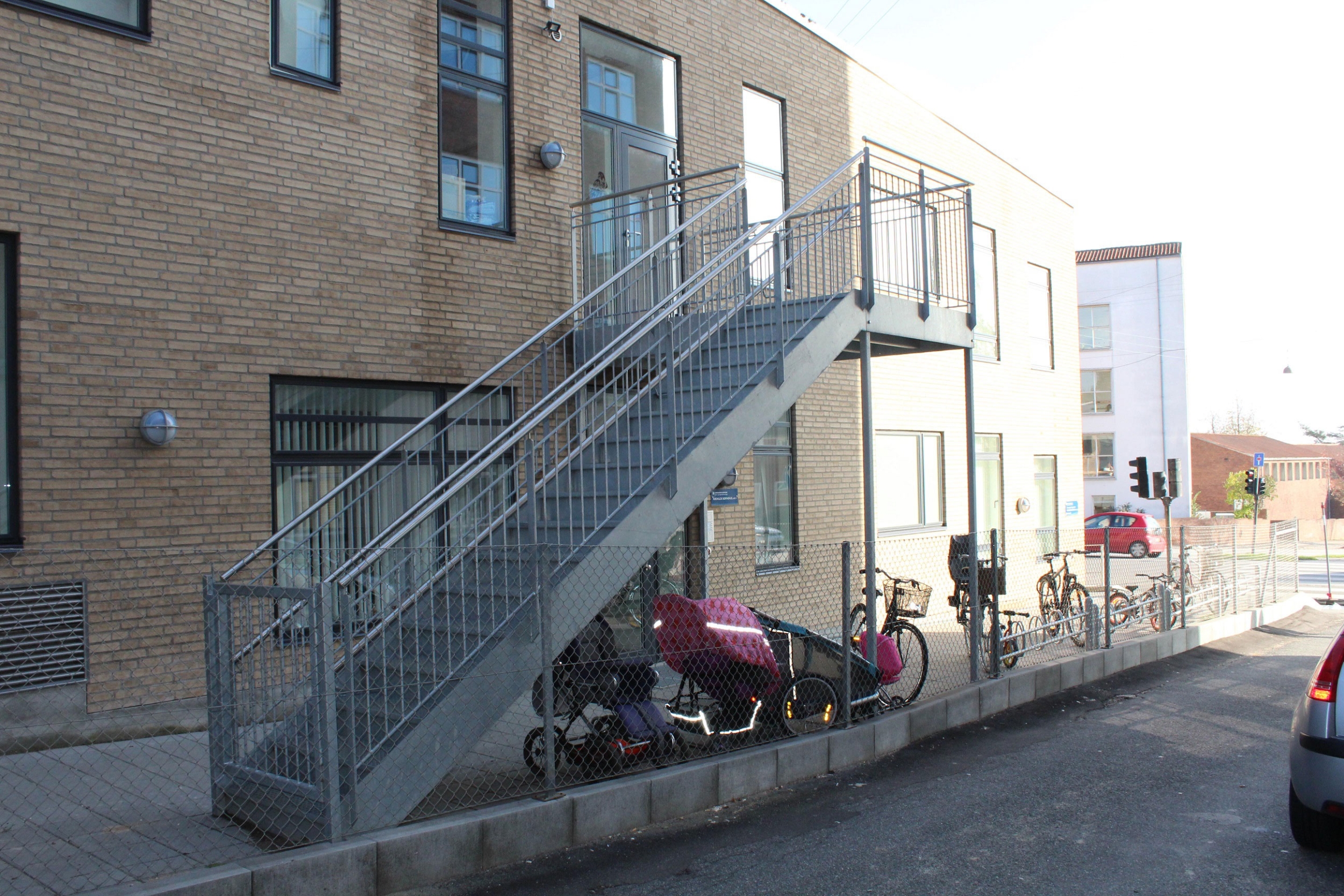Se f.eks. denne flotte brandtrappe i stål til Tagensbo Skole: