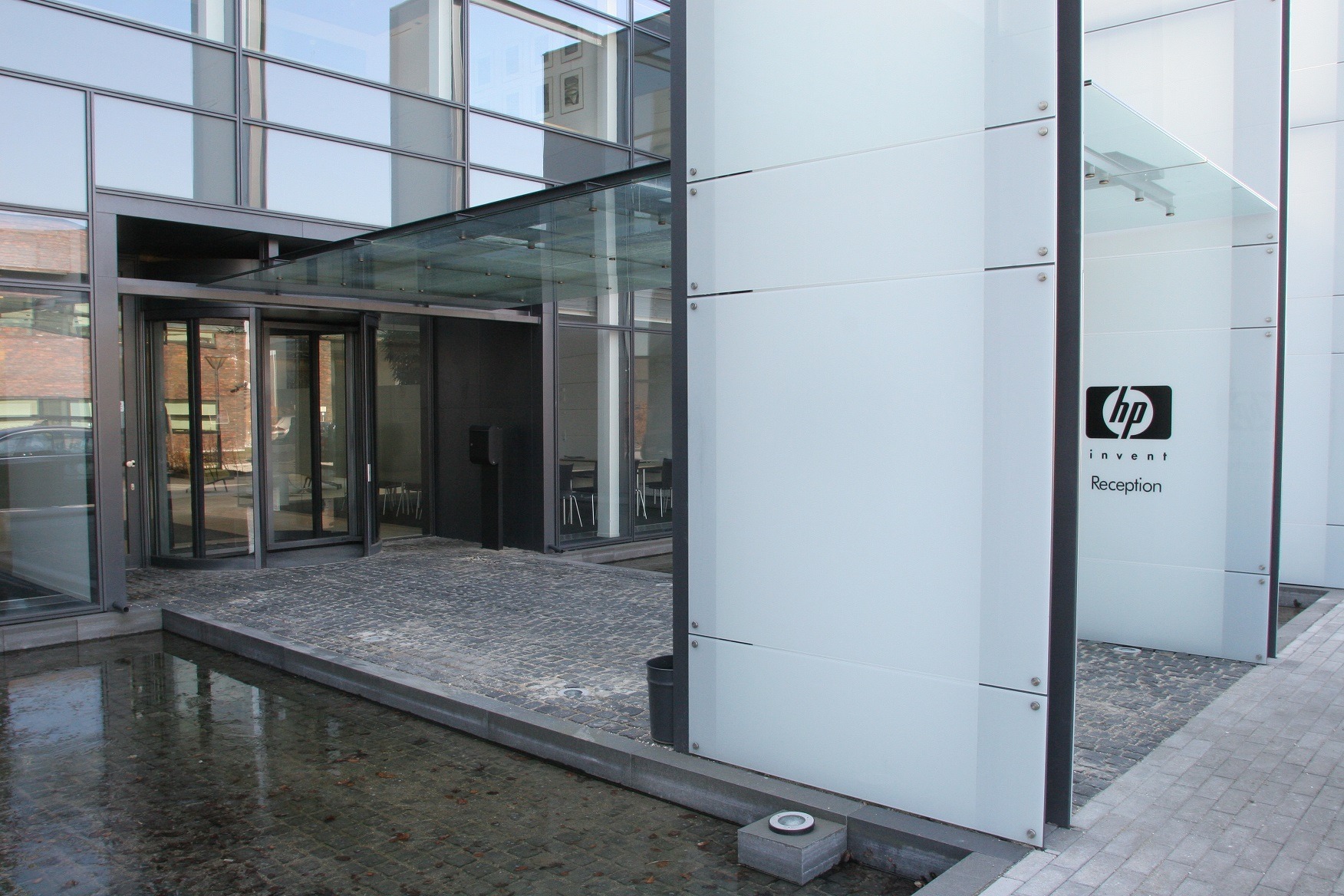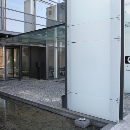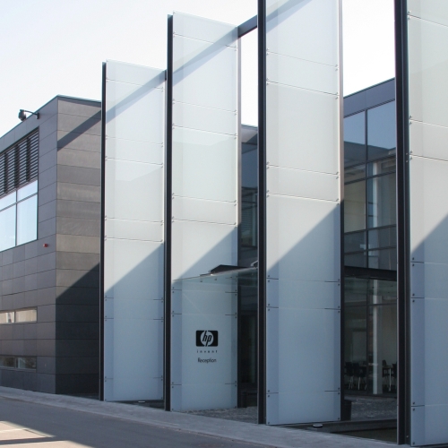 Facadekunst opført som søjler, påmonteret silketrykt glas på begge sider.
