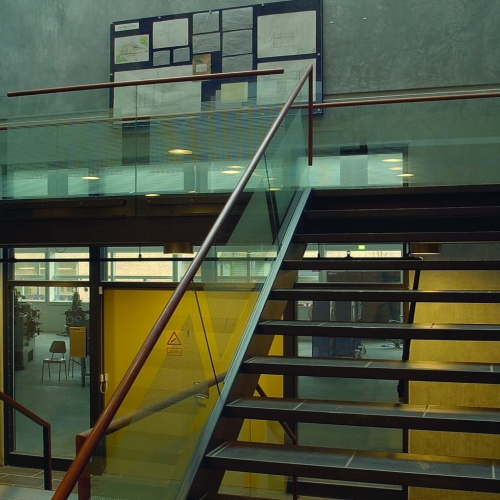 Gelænderudfyldning: 12 mm lamineret glas med silketryk
